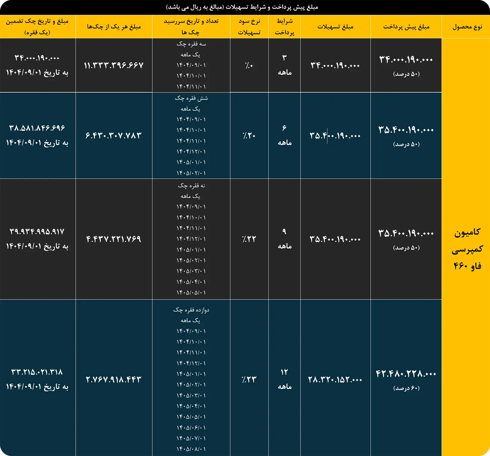 • شرایط پرداخت ۶ ماهه، ۹ ماهه و ۱۲ ماهه دارای یک سال بیمه بدنه می‌باشد.